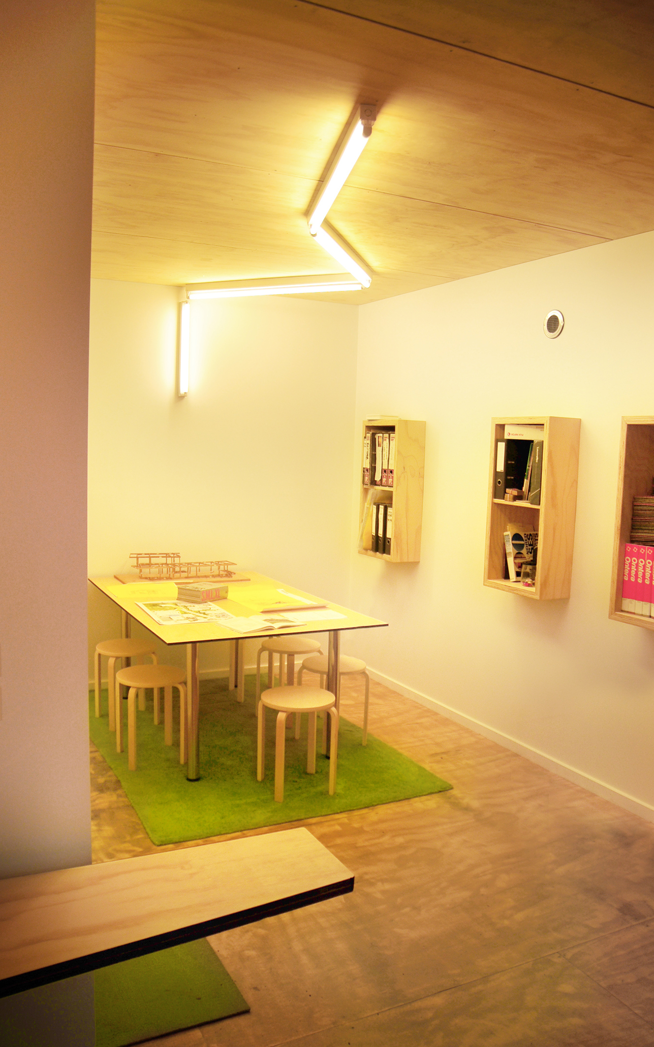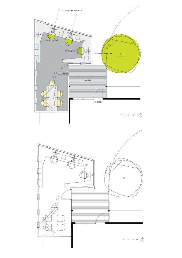 A tájépítész, ha a székében ül, akkor közvetlenül egy kis parkosított udvarra néz, talán hogy folyamatosan arra trenírozza magát: hogyan lehet ebben a művilágban némi zöldet csempészni az üveg és a beton közé. A munkatér és a tárgyaló között valójában csupán egy informális elválasztó elem található, így praktikusan tárgyalni és dolgozni is lehet ugyanabban a nyúlfarknyi térben.