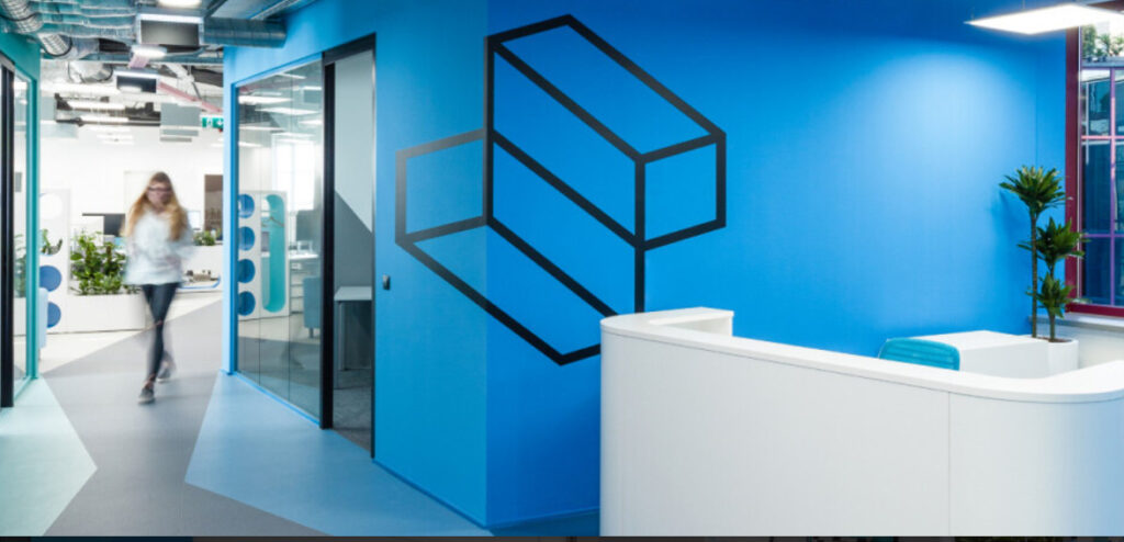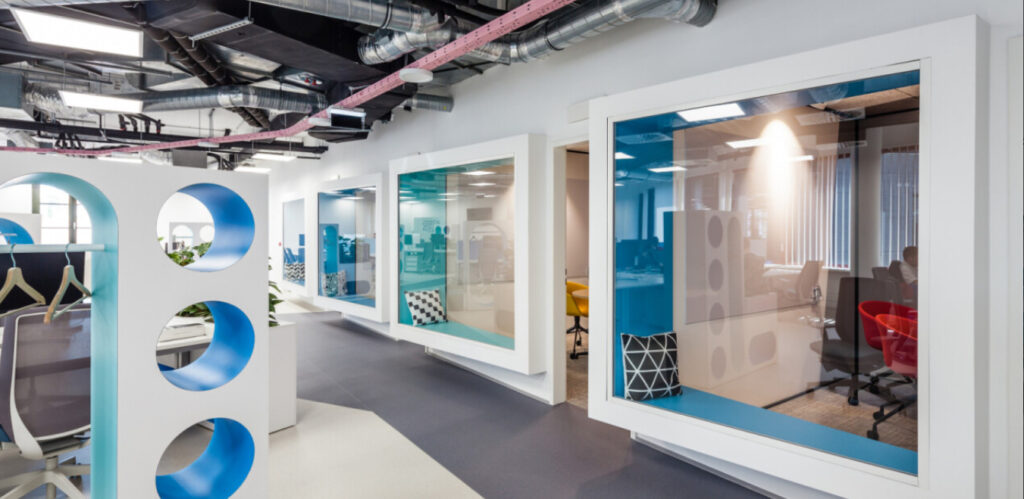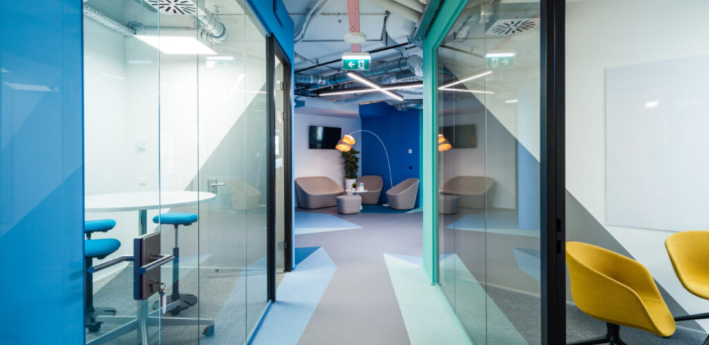 Az applikációt megnyitva miénk a tér, melyben a tájékozódás alapja egy négyzetrácsos fehér sík. Ez tehát a kiindulási alap, melyben egyszerű alap-geometriák transzformációival haladunk előre a modellezésben. Az irodatér is hasonló módon épül fel, hiszen négyzetrácsos fehér síkon indulunk, melyben az egyes karakteres elemek hangsúlyos módon jelennek meg: síklapok, körök, extrudált formák, kontúros felületek. A bejárati tér alapszínei a cég arculati színei, melyet meleg színpárokkal ellensúlyoznak a közösségi terekben és tárgyalókban. Mindezt úgy tervezték meg, hogy minden látványban keverednek a különböző színes foltok, miközben a nyitott munkaterek csendesebb, monokróm terekként támogatják a fókuszált munkát.